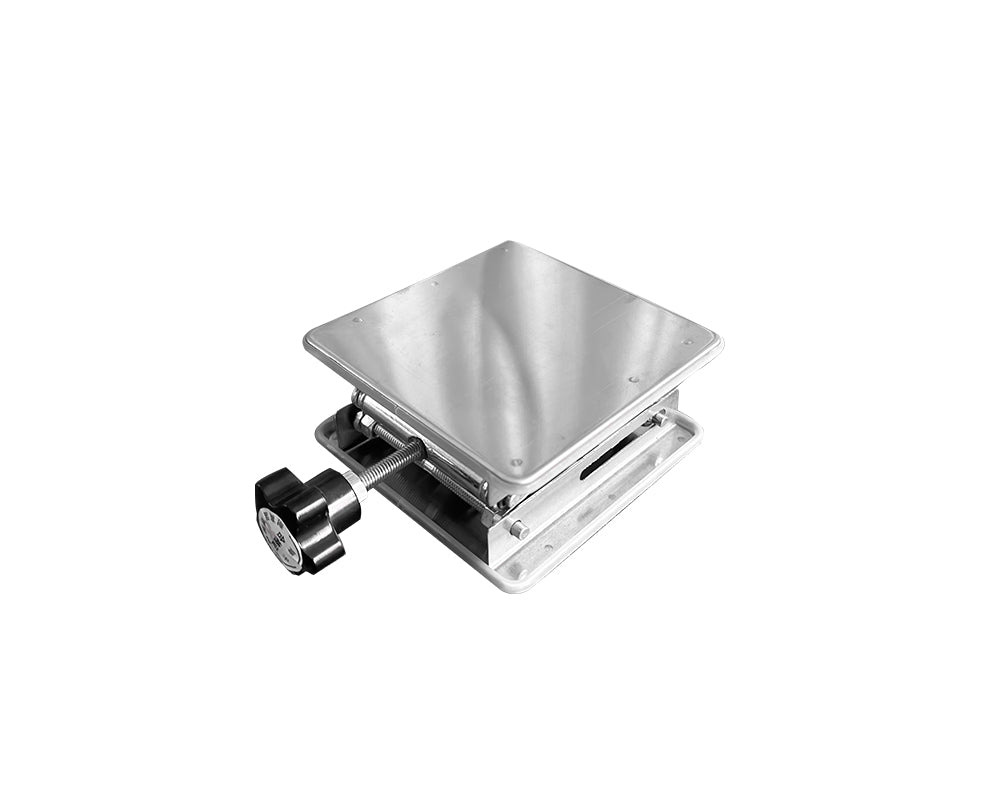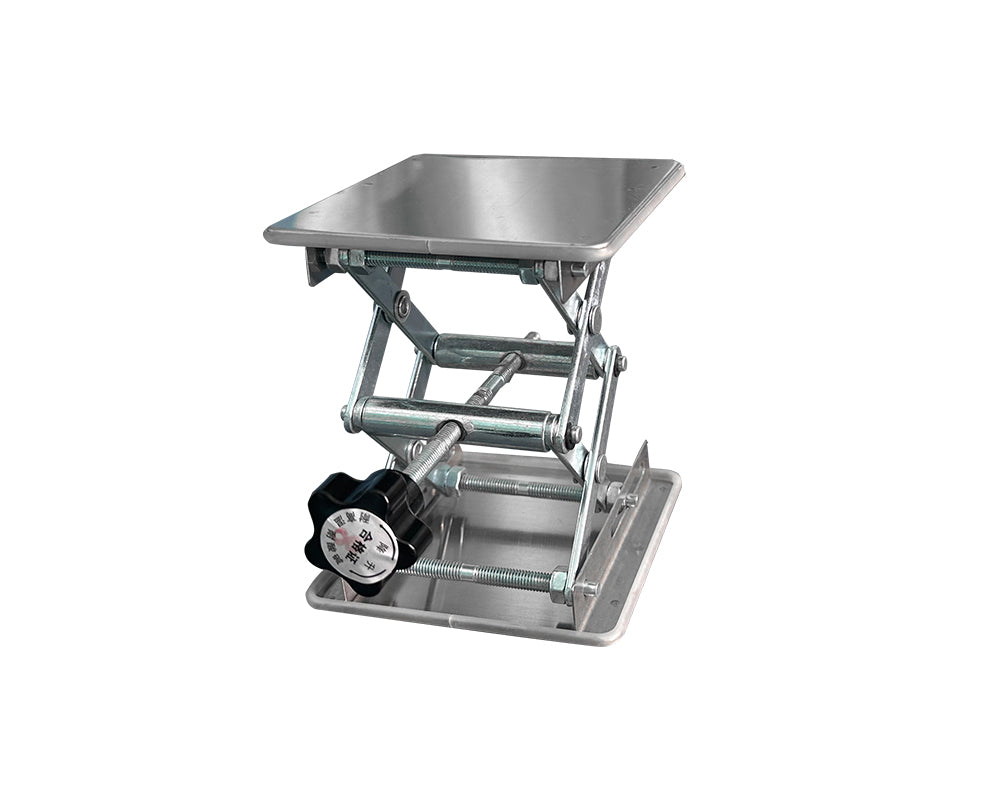 Raises and lowers sample vessels to a stationary probe mounted within the sound enclosure. The platform of the jack stand is 6" x 6".